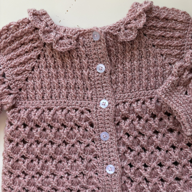 Casaquinho 100% artesanal, feito à mão em lã especial para bebés, macia e confortável para a pele delicada dos primeiros meses.
