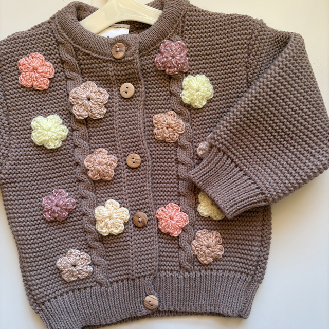 Casaco em malha macia, feito em máquina com aplicação de flores em croché manual — cada uma feita com carinho e atenção ao detalhe.