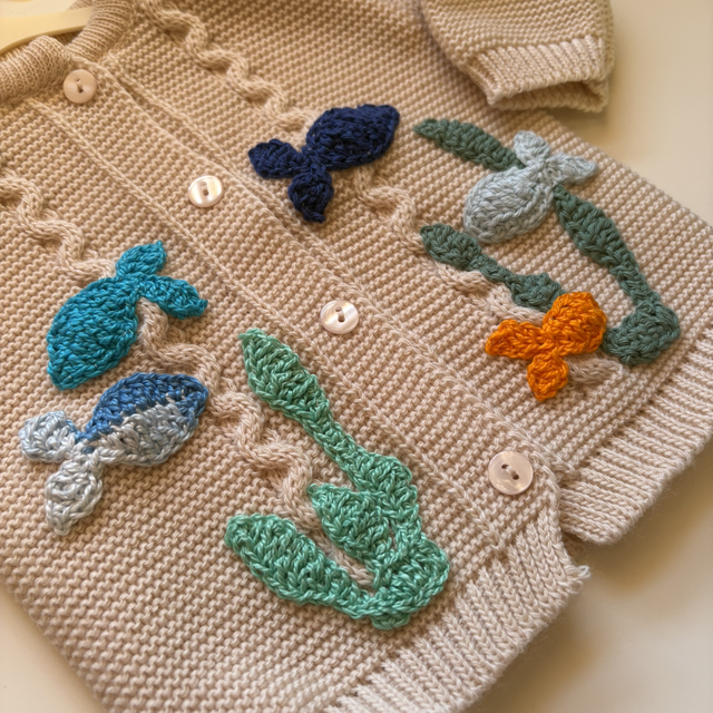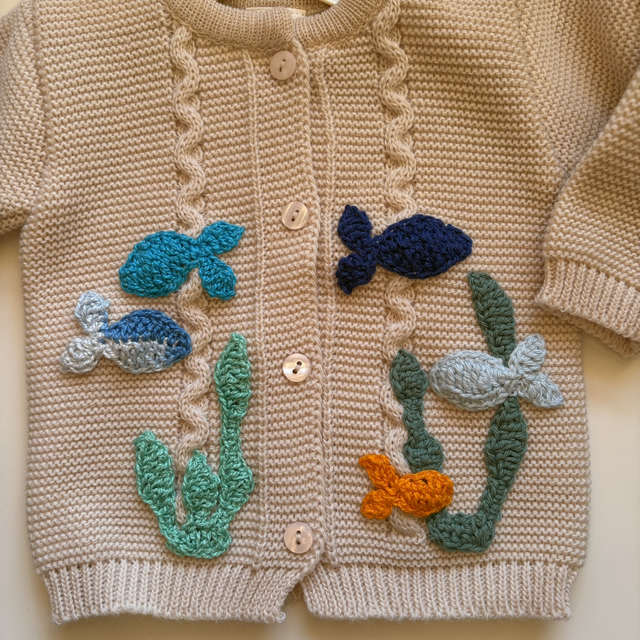 Casaco em malha macia, feito em máquina com aplicação de peixes e algas formando um amoroso fundo do mar