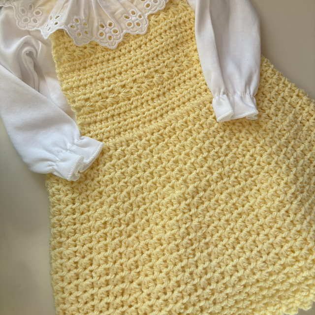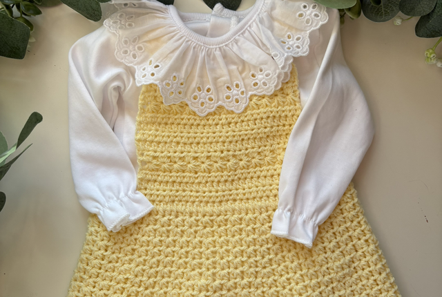 Delicado e cheio de encanto, este vestido em croché feito à mão é ideal para os primeiros meses do bebé.